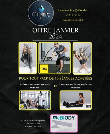 Offre de Janvier 2024 Cryo-Relax & Fit Pour l’achat d’un Pack de 10 séances Personal Coaching = 1 Séance de Sport TRX 🎁 OFFERTE + 1 Séance de Pressothérapie (Normatech) 🎁 OFFERTE 📞: 0387370379 💻:contact@cryorelax-fit.fr #metzville #metznotreville #metzeler #letriangleimperialmetz #metzinspire #metzinsolite #bienêtre #sport #trx #trxworkout #cryotherapiecorpsentier #fitness #pressotherapie #normatecrecovery #normatec